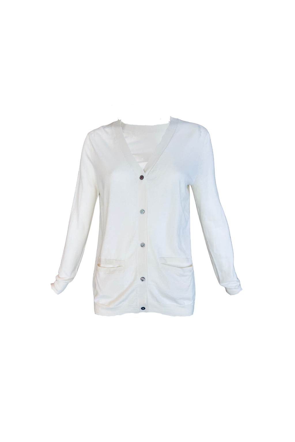Paper weight pima cotton v-neck five button cardigan with welt pockets. The perfect thing to keep your shoulders from getting cold on those chilly summer nights.