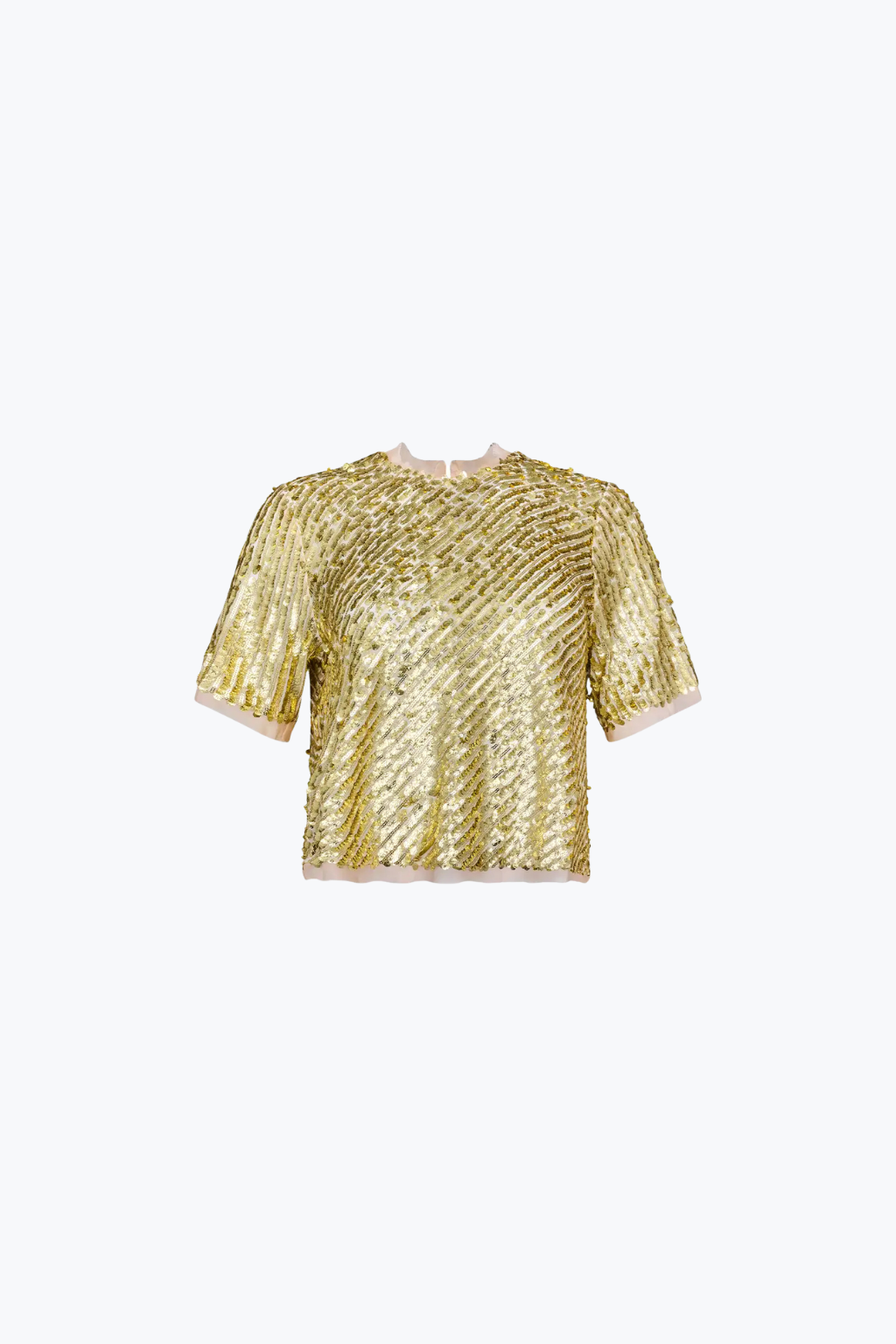 Pixie reimagines the classic T-shirt in festive shine. Drenched in gold sequins, this true showstopper is finished with soft chiffon trim at the neckline, sleeves, and hem—adding airy movement and a refined edge. The exquisite craftsmanship and shimmering details make the Pixie Top a dazzling addition to any wardrobe—an unforgettable piece destined to turn heads at every occasion.