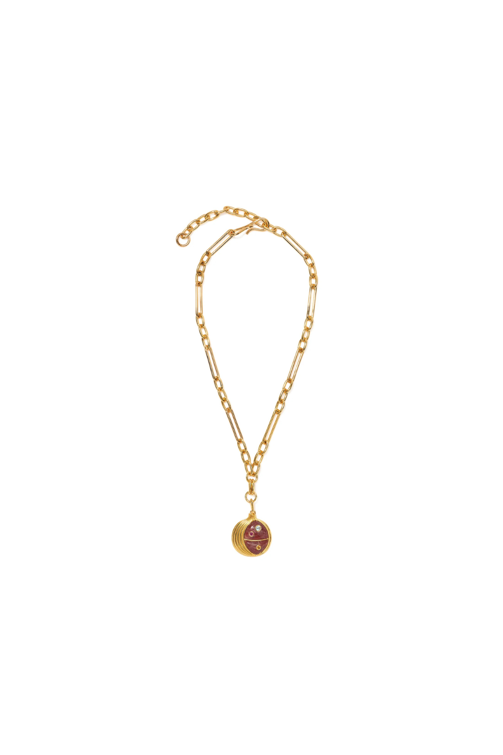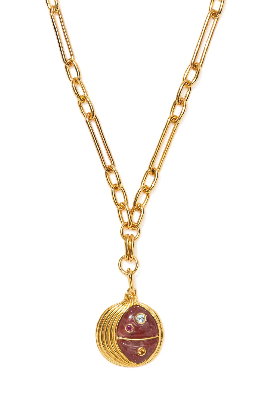 Inspired by the verdant fruits that dot the streets of Seville, Spain, this gold-plated chain link necklace is an incredibly special piece that showcases a strawberry quartz pomegranate pendant inlaid with sky blue topaz, pink rhodolite, and citrine stones.