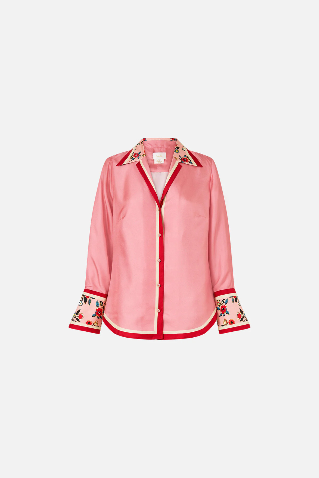 Designed in Australia, the Pink Porto Pyjama Shirt refines blossoming romance, floral gardens dance along pastel pink mosaics kissed with red touches. Lovingly handcrafted, this CAMILLA silk pyjama shirt is a complimentary slim fit throughout the body which falls to a hip-length hemline. The relaxed long sleeves feature wide split cuffs that drape beautifully across the wrist.
