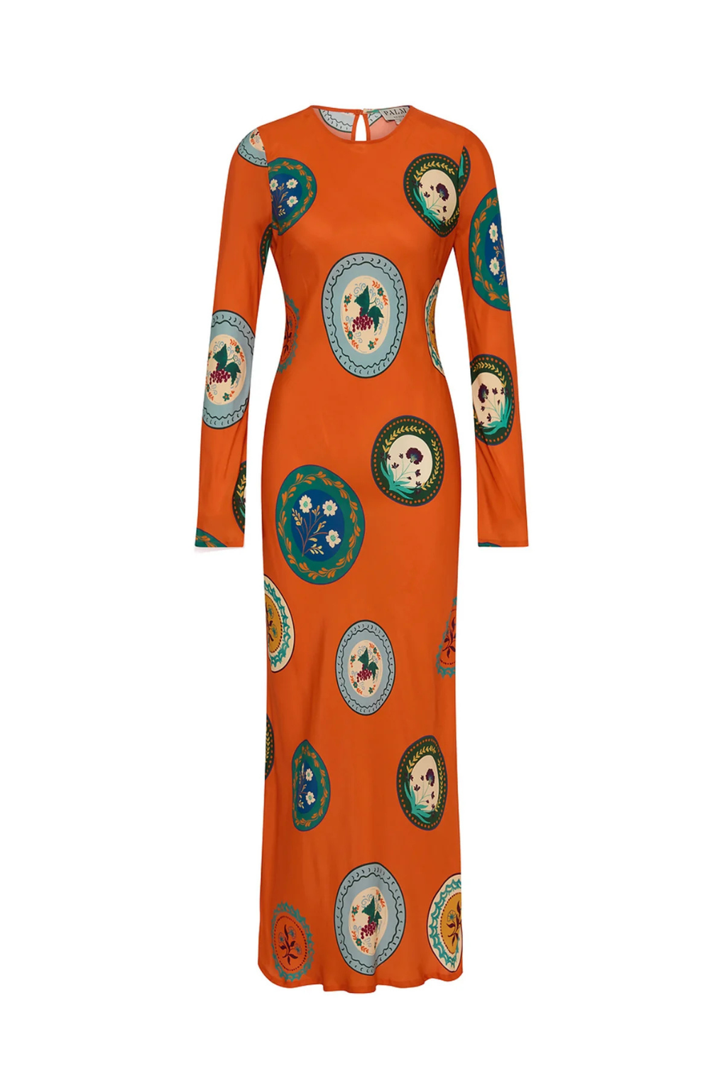The Roma Dress, printed in the exclusive Orange Plates print, is crafted from a premium Lyocell blend. Cut on the Bias, the Roma Dress is designed to softly skim the body for a flattering fit. Featuring a rounded high neckline, flared sleeves and an ankle length hem.