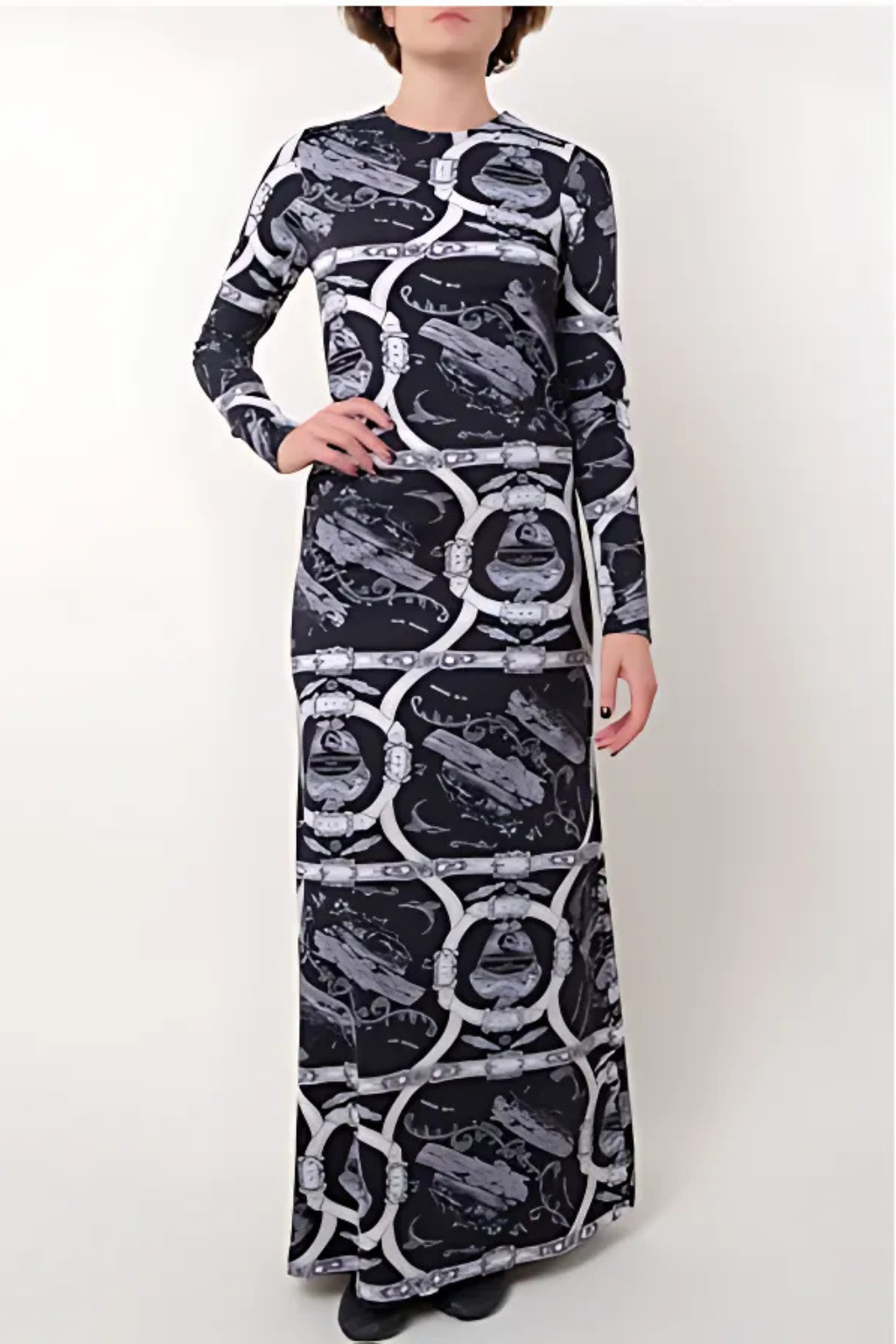Long sleeve full length jersey dress in a viscose blend. Classic print “Attachemnt” exclusively for La Prestic Ouiston.