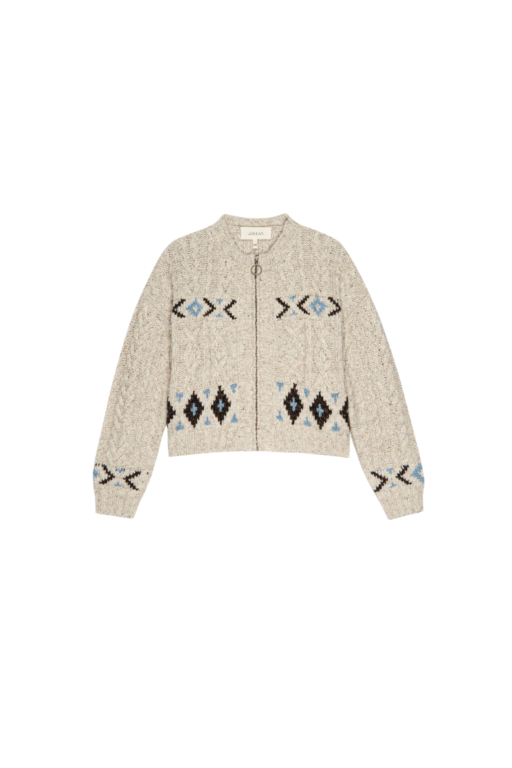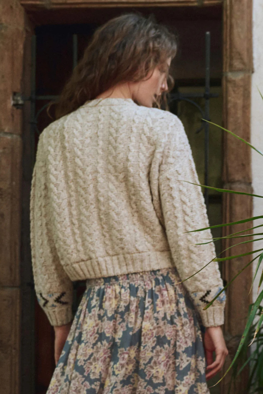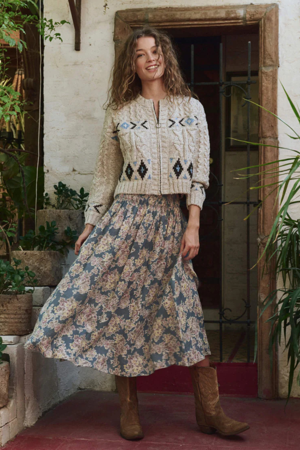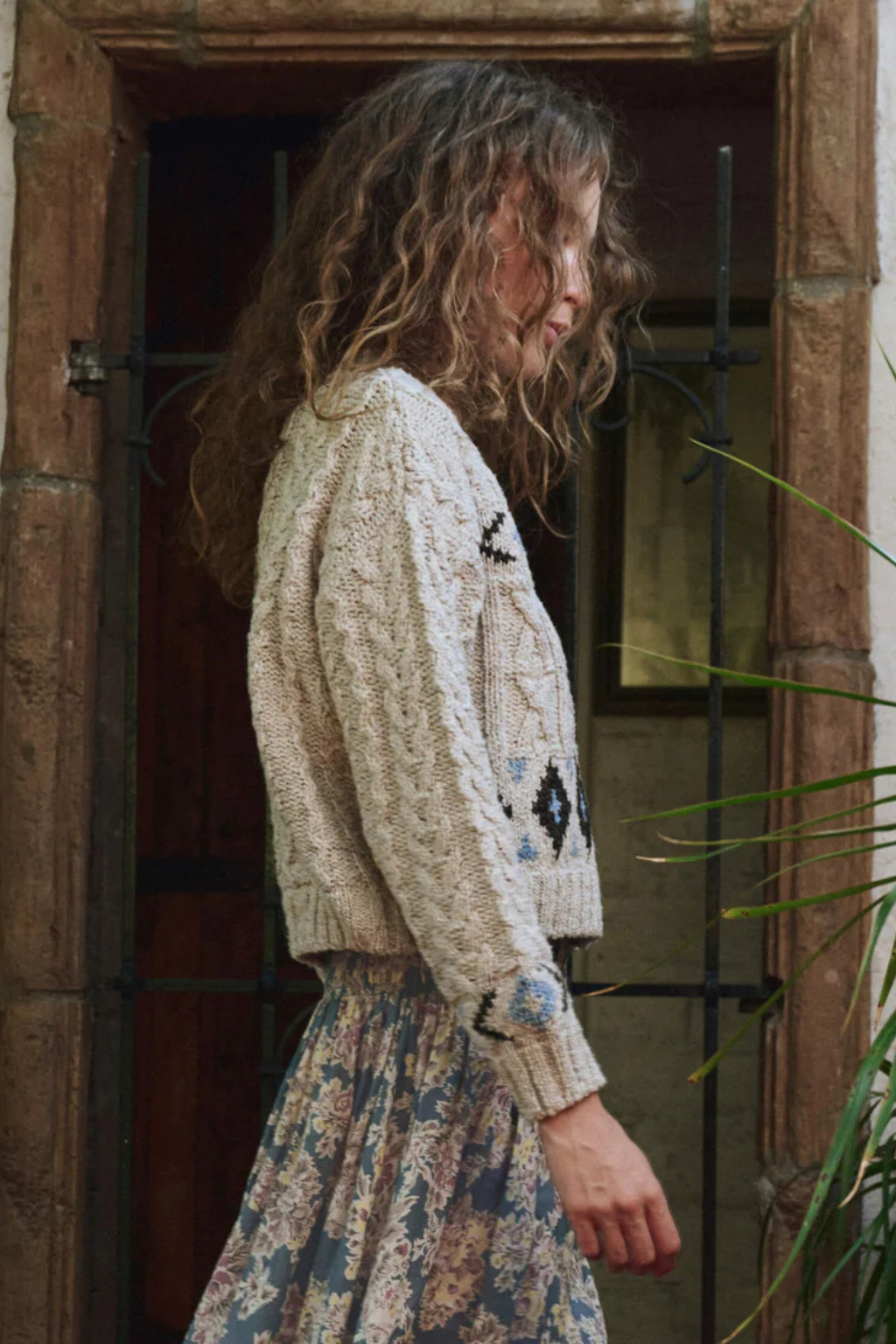 Inspired by vintage Southwestern clothing, The Cavern Cardigan offers a boxy, thoughtfully shrunken fit with a flattering cropped length. The zip-front closure, featuring a metal ring zipper pull, adds an unexpected touch of detail. Knitted in a chunky cable stitch, the cotton, wool, and silk blend yarn is perfect for transitioning from late summer into fall. With neutral shades, Southwestern motifs, and a delicately speckled yarn, this cardigan provides the perfect texture and warmth for cooler nights and coolers days ahead.