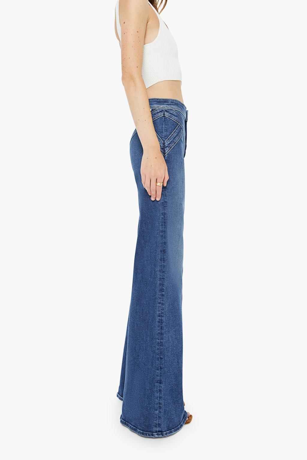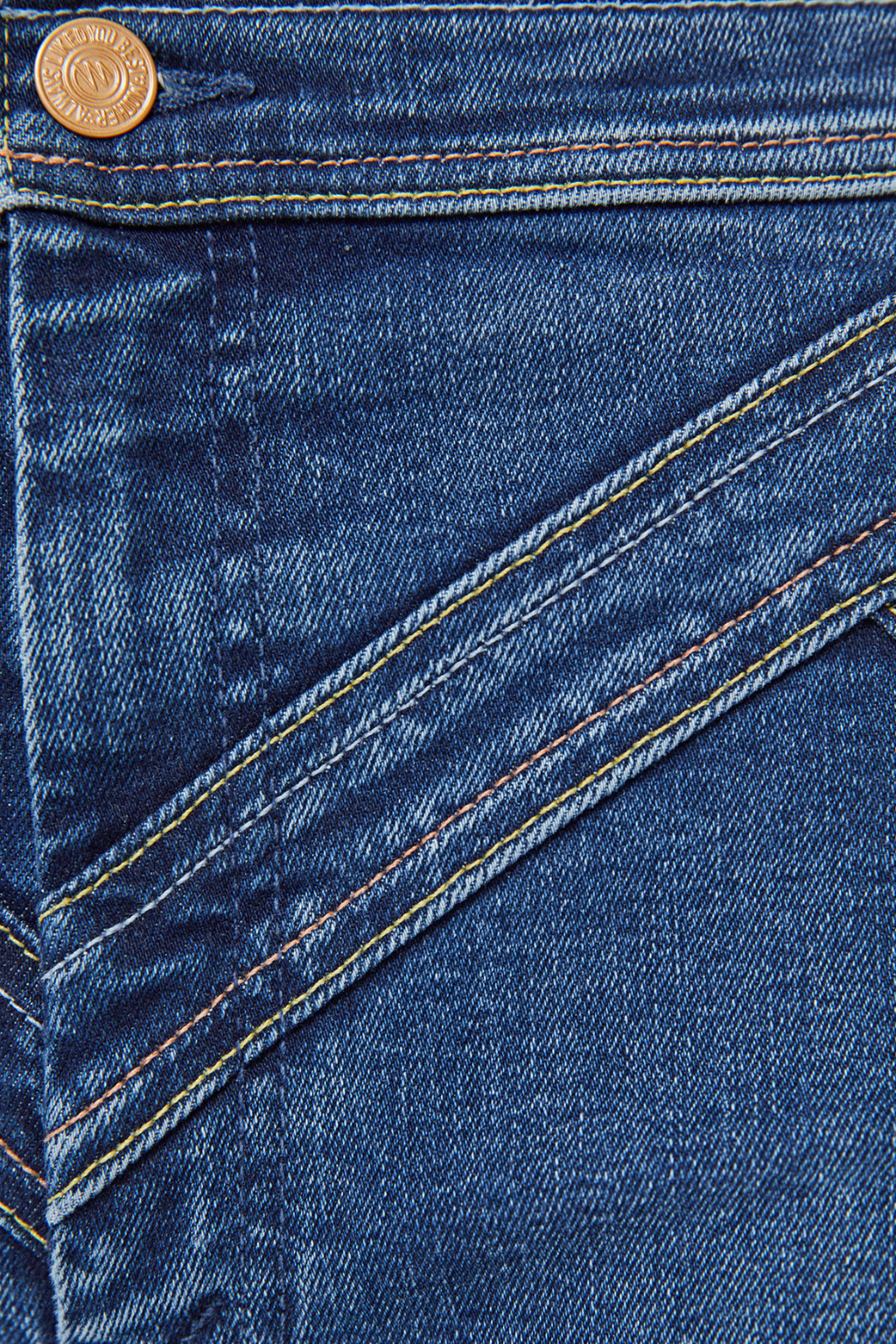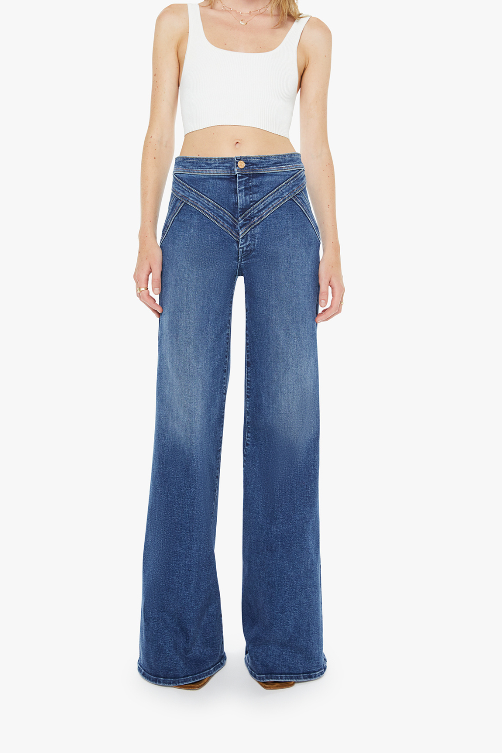 Hidden treasure. High-rise wide-leg pants with a zip fly, seamed details on the waist, slit pockets and a long 34-inch inseam with a clean hem. Made from stretch denim, Prized Possession is a mid-blue with subtle fading and rainbow thread embroidery throughout.