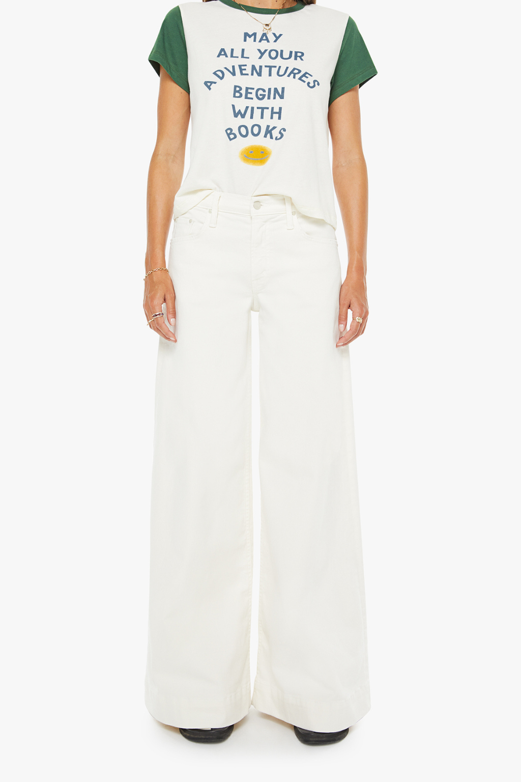 Well read. A crewneck tee with extra-short sleeves and a slightly shrunken fit. Made from 100% Supima cotton in off-white with green trim, the tee features blue block text and a smiley face graphic on the front.