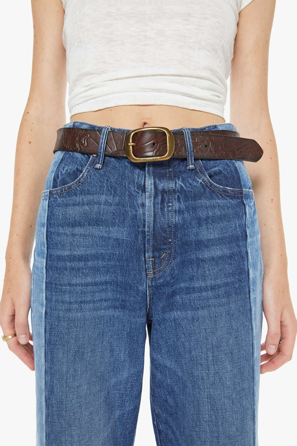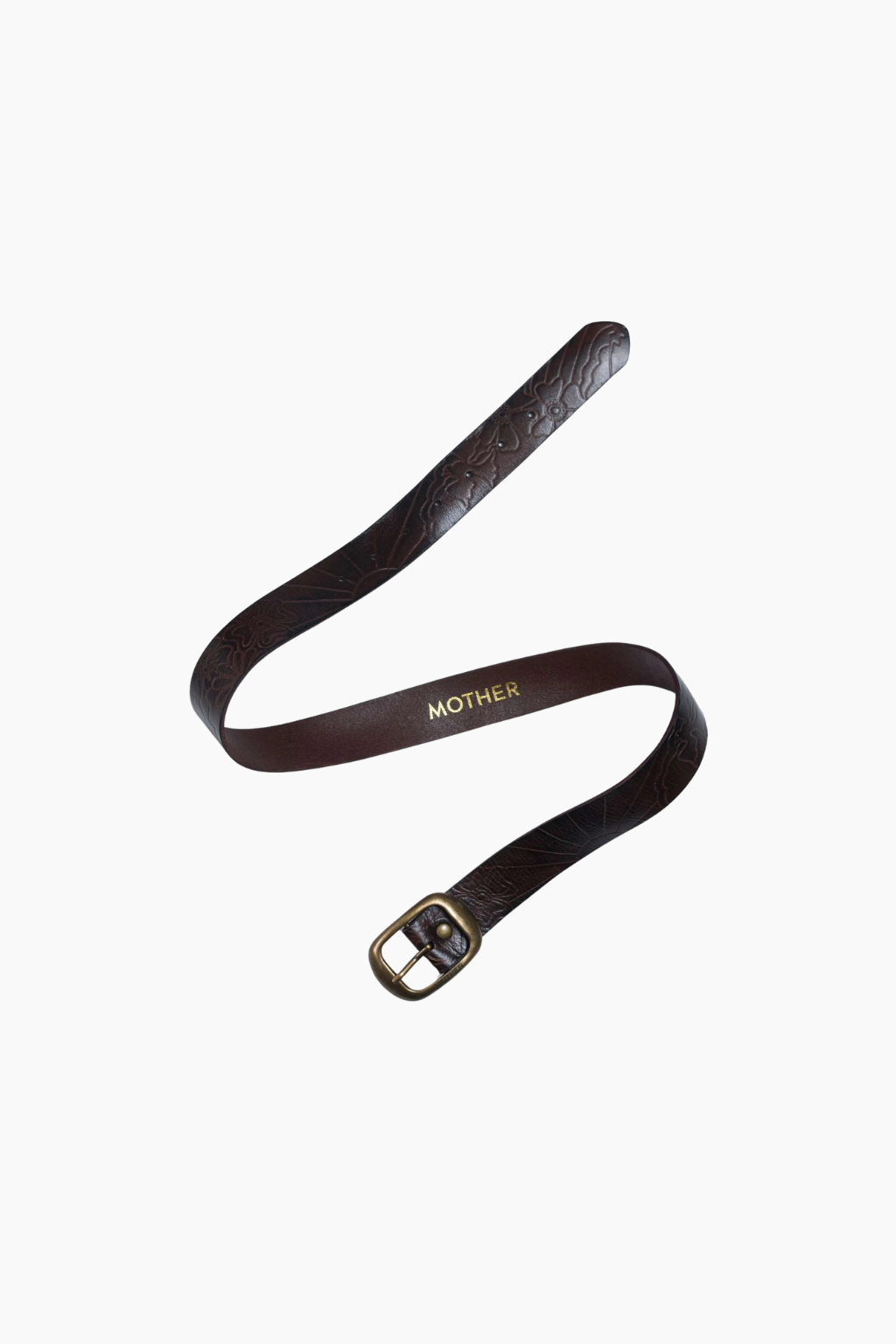 Buckle up. A leather belt with an oversized brass buckle. The Magpie is made from 100% cow leather in dark brown with embossed flowers and suns throughout.
