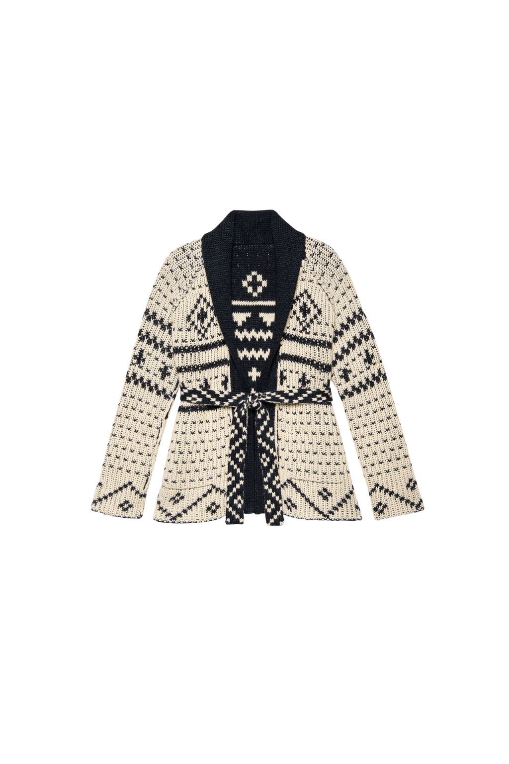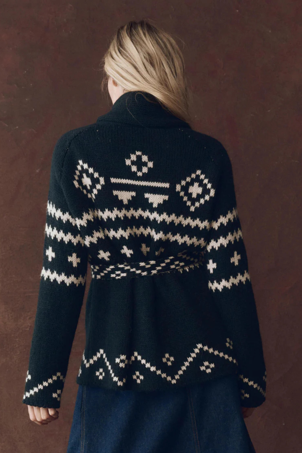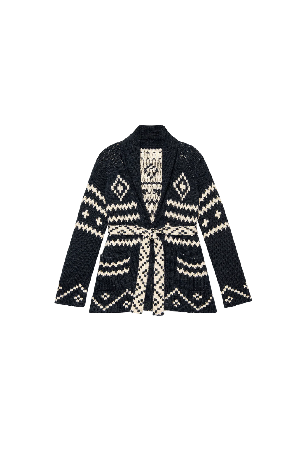 The Reversible Shepherd Cardigan is a longer-length shawl style spun from alpaca in a double jacquard technique for full reversibility. With raglan sleeves, no front closure, and a removable waist tie, it’s easy to wear two ways—on the cream side or navy side.