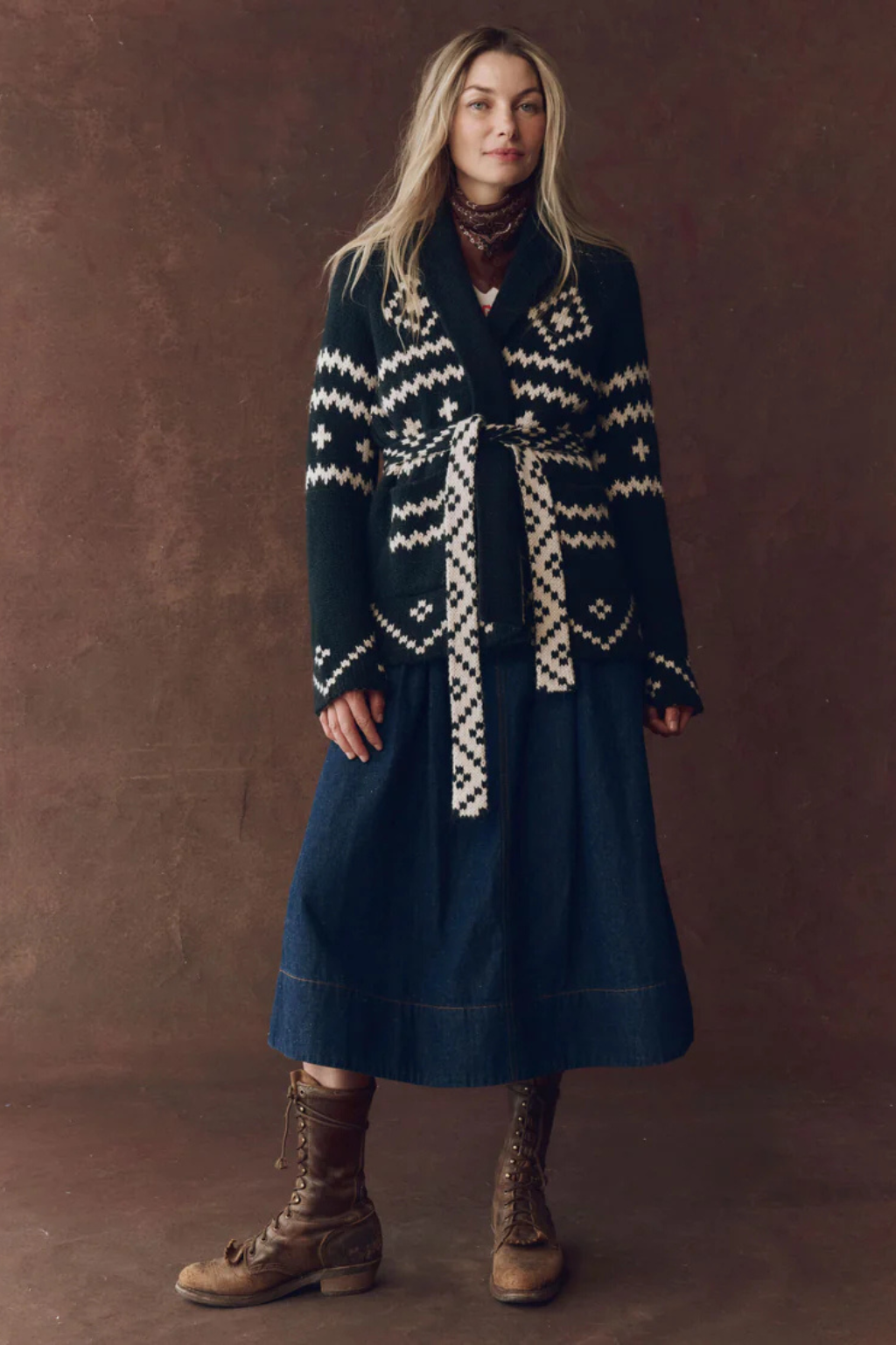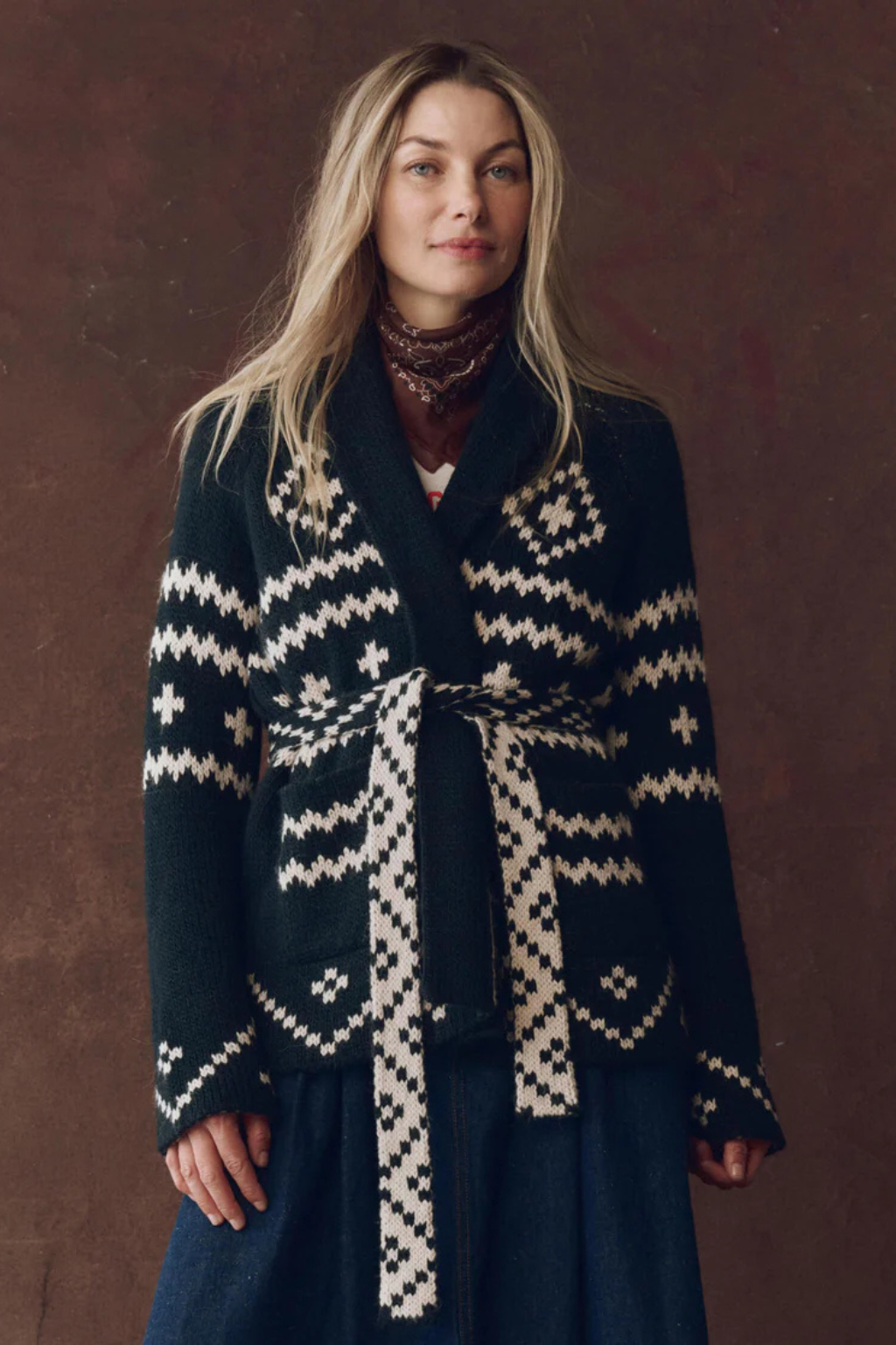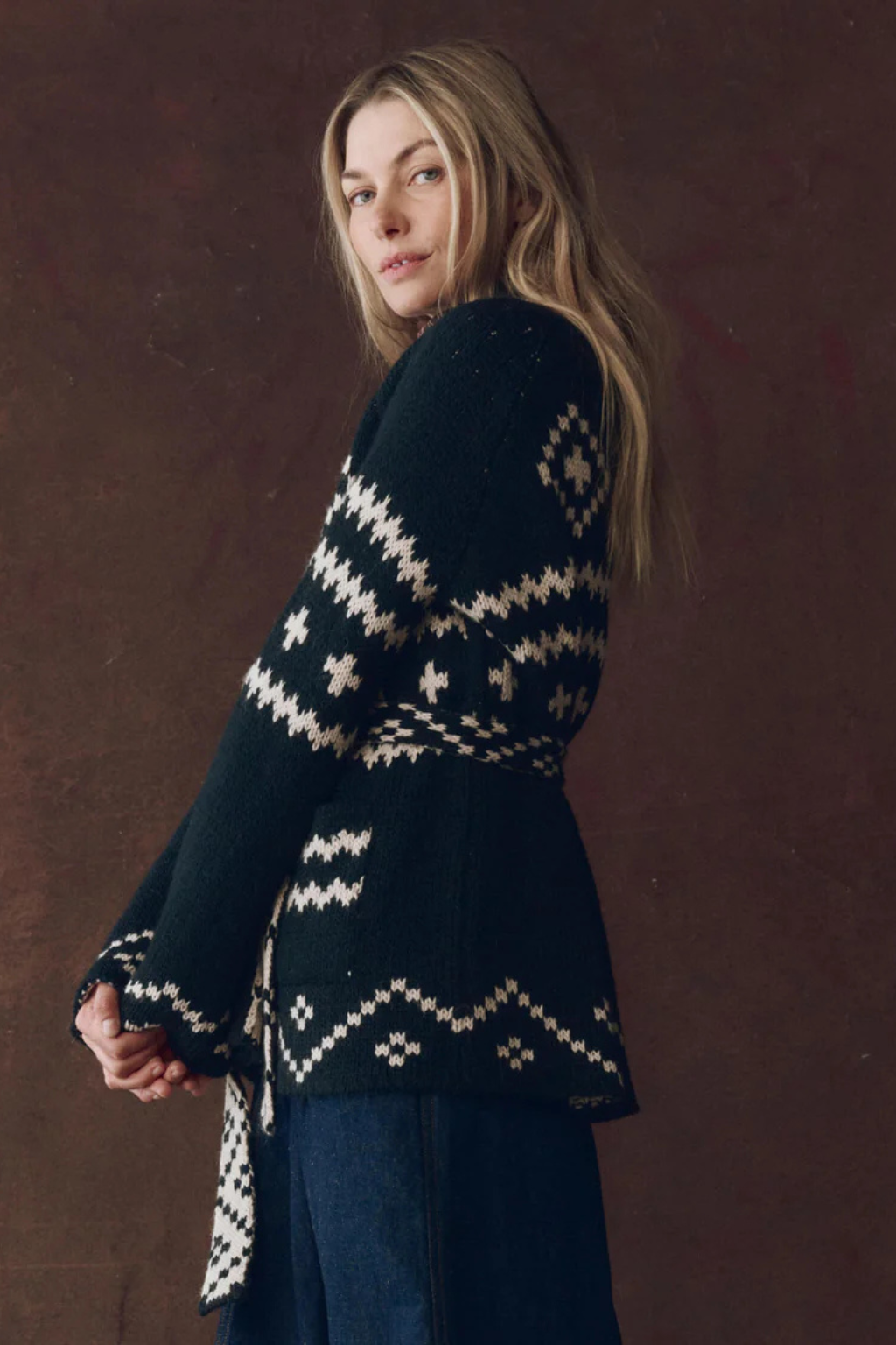The Reversible Shepherd Cardigan is a longer-length shawl style spun from alpaca in a double jacquard technique for full reversibility. With raglan sleeves, no front closure, and a removable waist tie, it’s easy to wear two ways—on the cream side or navy side.