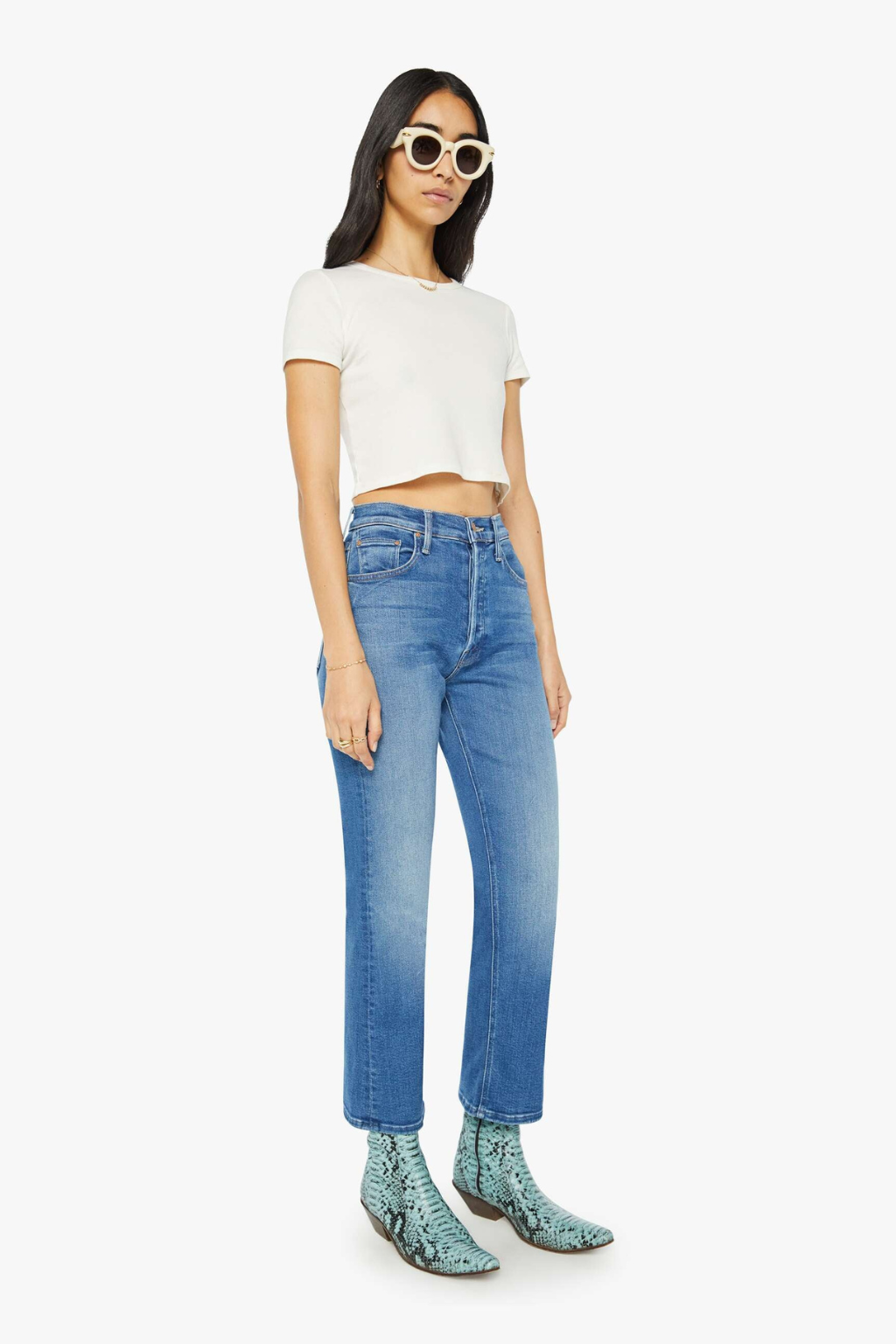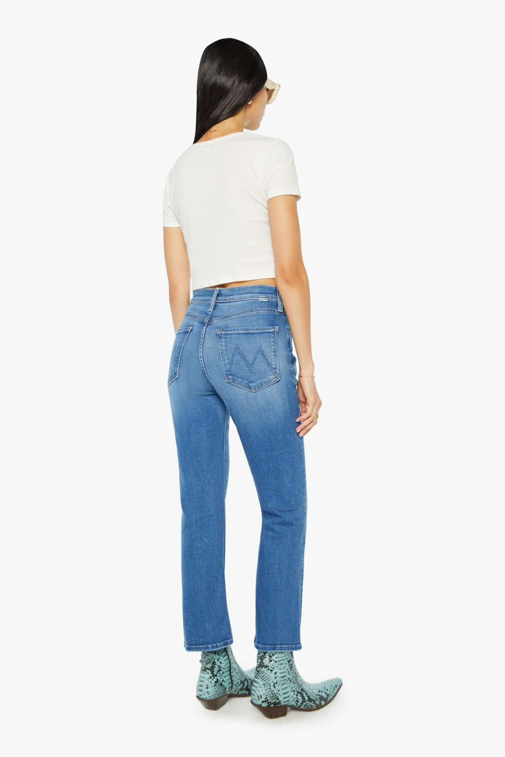 TGIF. A high-rise flare with a button fly and a clean ankle-length hem. Made from stretch denim, Work Hard Play Hard is a mid-blue wash with subtle whiskering and fading at the knees.