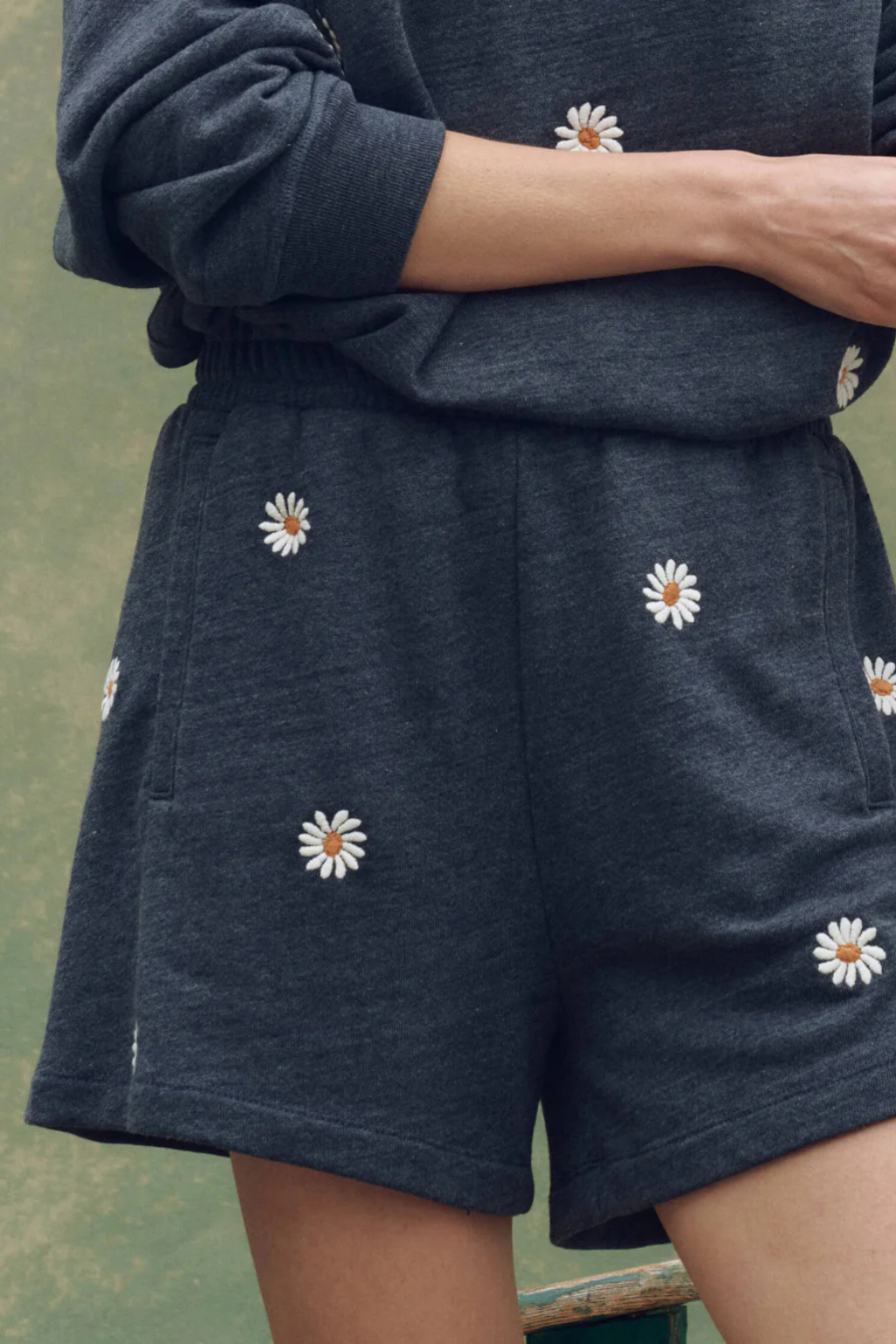 The Victory Short is the laid-back companion to the Victory Sweatpant — reimagined with a floral twist.  Designed with a wide, self-fabric waistband and stitched-through encased elastic, it offers a subtle nod to vintage athletic wear. The silhouette is clean with no side seams, while wide welt pockets add easy functionality.  Cut from a washed tri-blend terry with a vintage-inspired heathered finish, each pair is made in Los Angeles and finished with signature floating daisy embroidery — a technique that makes every piece one-of-a-kind.