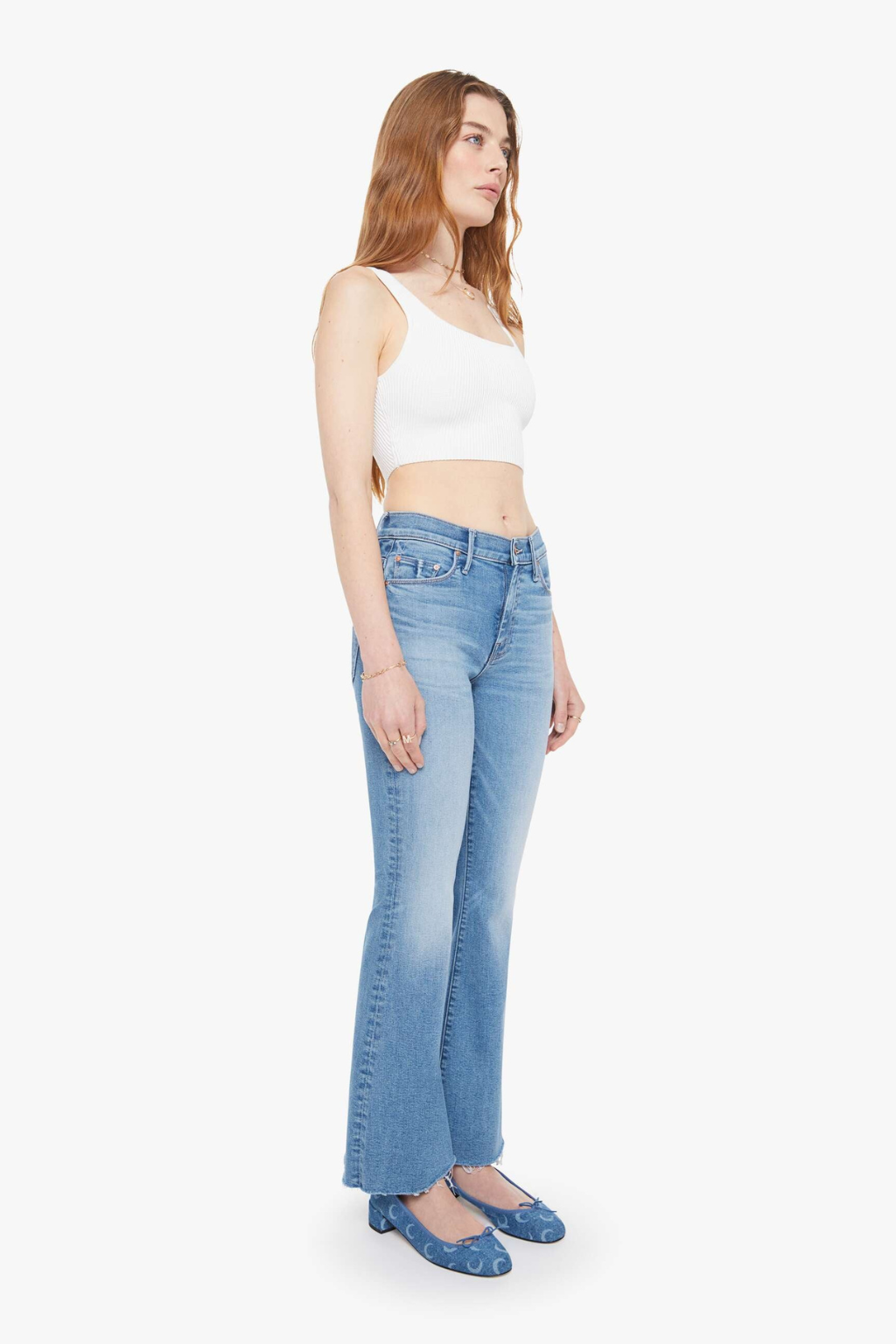 Full throttle. Mother's most popular mid-rise flare has a zip fly, 32.25-inch inseam and a frayed hem. Made from a blend of recycled stretch denim, Ride Hard Live Louder is a light blue with subtle whiskering and fading at the knees.