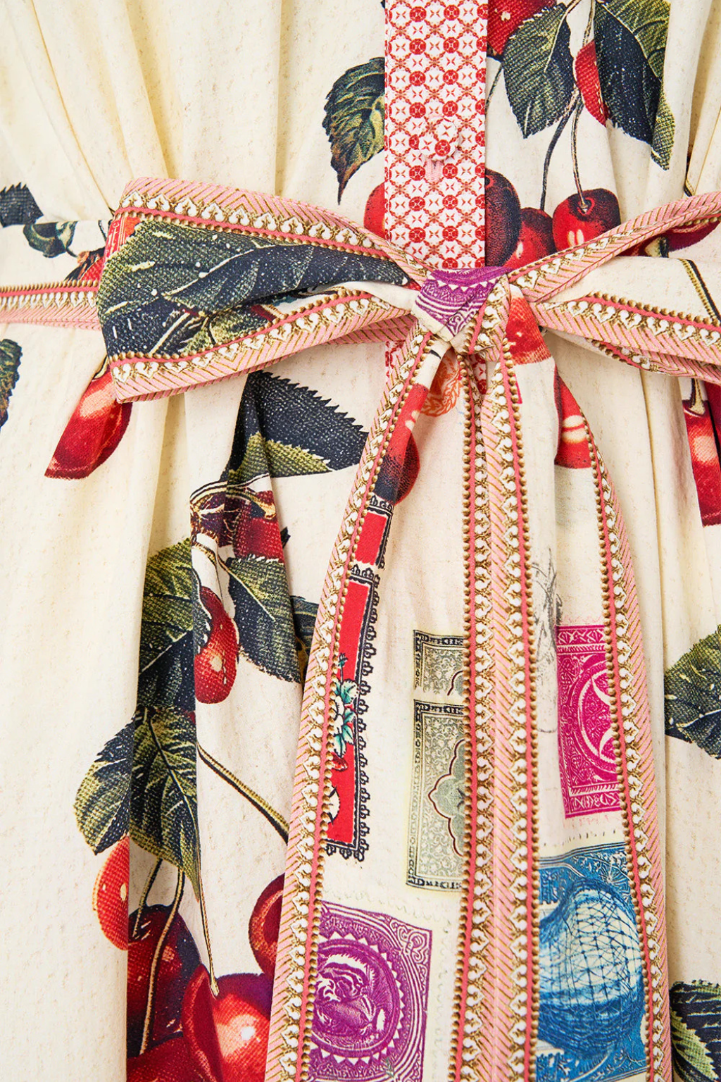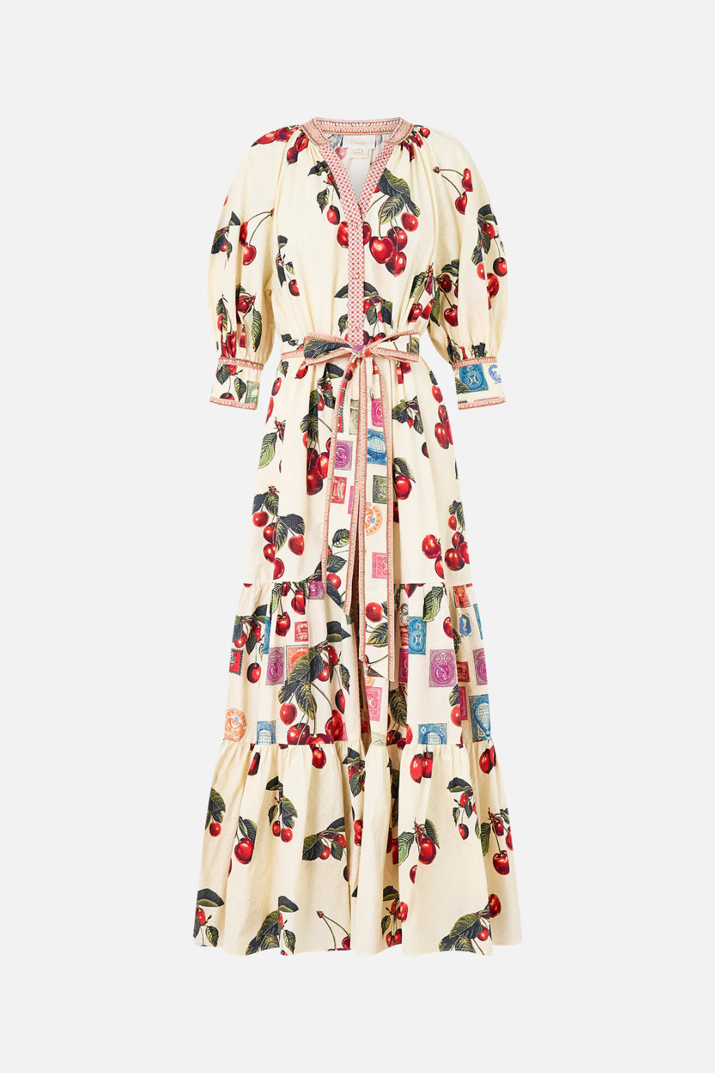 The Notes From The Road Tiered Shirt Dress With Short Sleeves is a handcrafted cotton silhouette designed by our in house artisans. Reimagined in an exclusive limited edition print, this full length maxi dress is adorned with feminine blouson sleeves, tapered with detailed cuffs and finished with a flattering button through front.