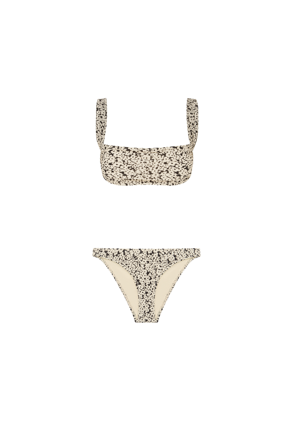 The Vacances Crop Top is smooth over the bust with soft removable padding. Adjustable straps for a versatile fit. Multiple sizing options offered by back closure. Paired with the Staple Pant which is designed to sit just above your hip bones and features twin needle finish for a comfortable and secure fit. This bikini is crafted in the exclusive in—house created Bisou textile print.