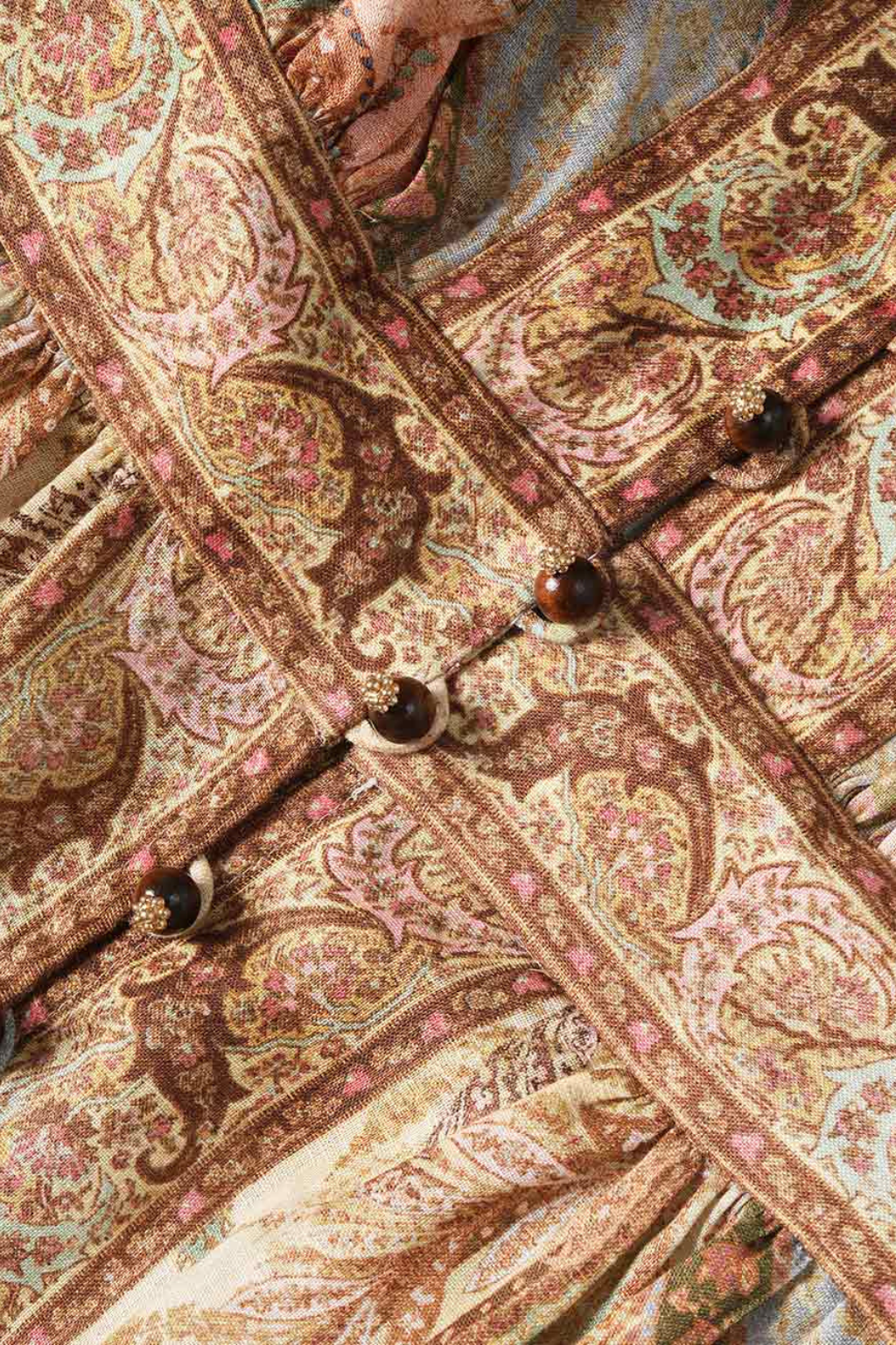 The Wanderlust Plunge Midi Dress in Tapestry Multi from the Resort Swim 2026 Collection. A linen midi dress featuring a plunging V-neckline, long tubular sleeves with elasticated cuffs, rouleau buttons down the center front, a fitted waistband and flared skirt. Center back invisible zip closure.