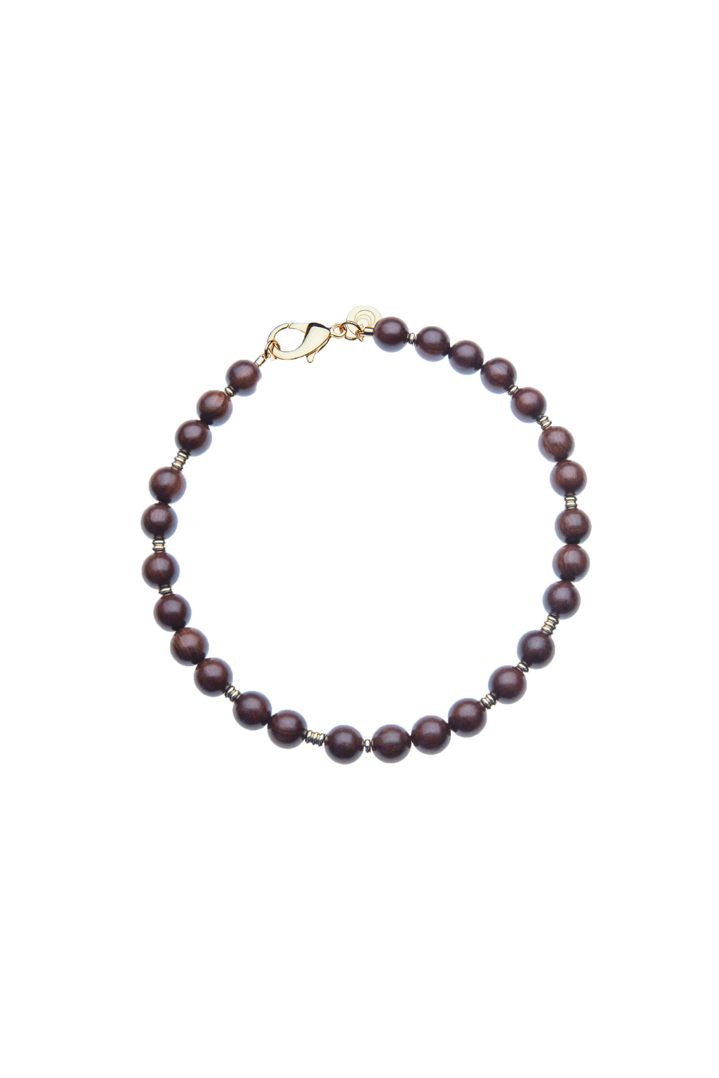 • Natural wood beads make up the body of the necklace with pops of gold beads in between. Clasp is brass with 14k gold plating.