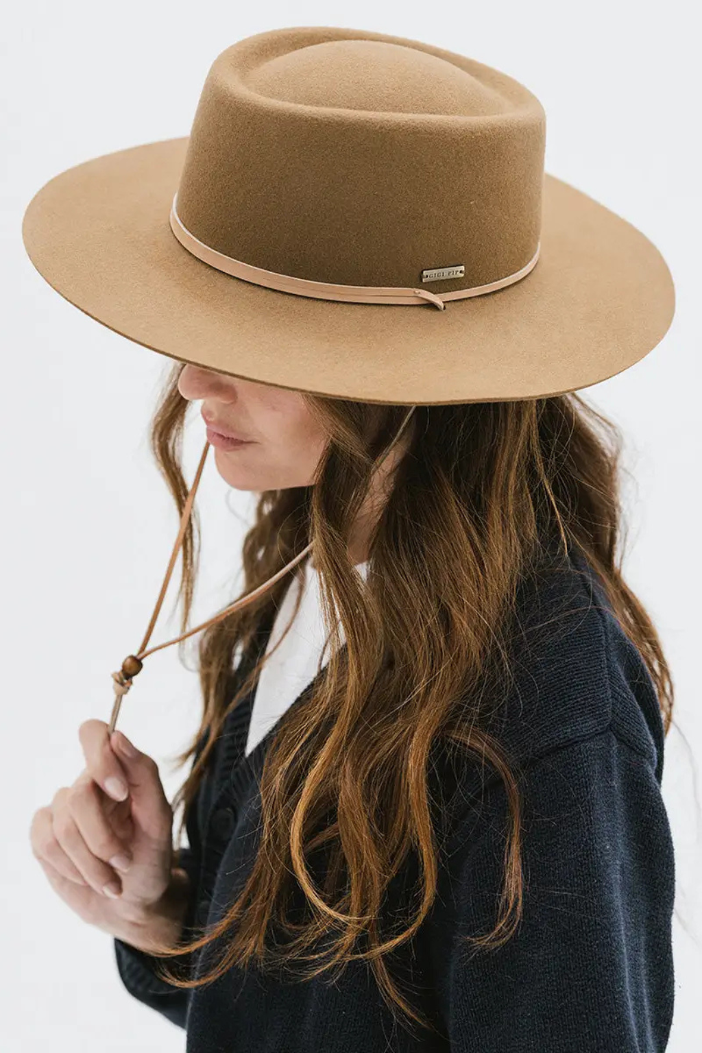 Wren's telescope crown lends a hint of Western style to a classic flat-brim shape. A hat versatile enough to pair with worn jeans to a linen dress. Wren features an adjustable leather chinstrap that gives it a little extra somethin' + can easily tuck into the crown for an additional look.
